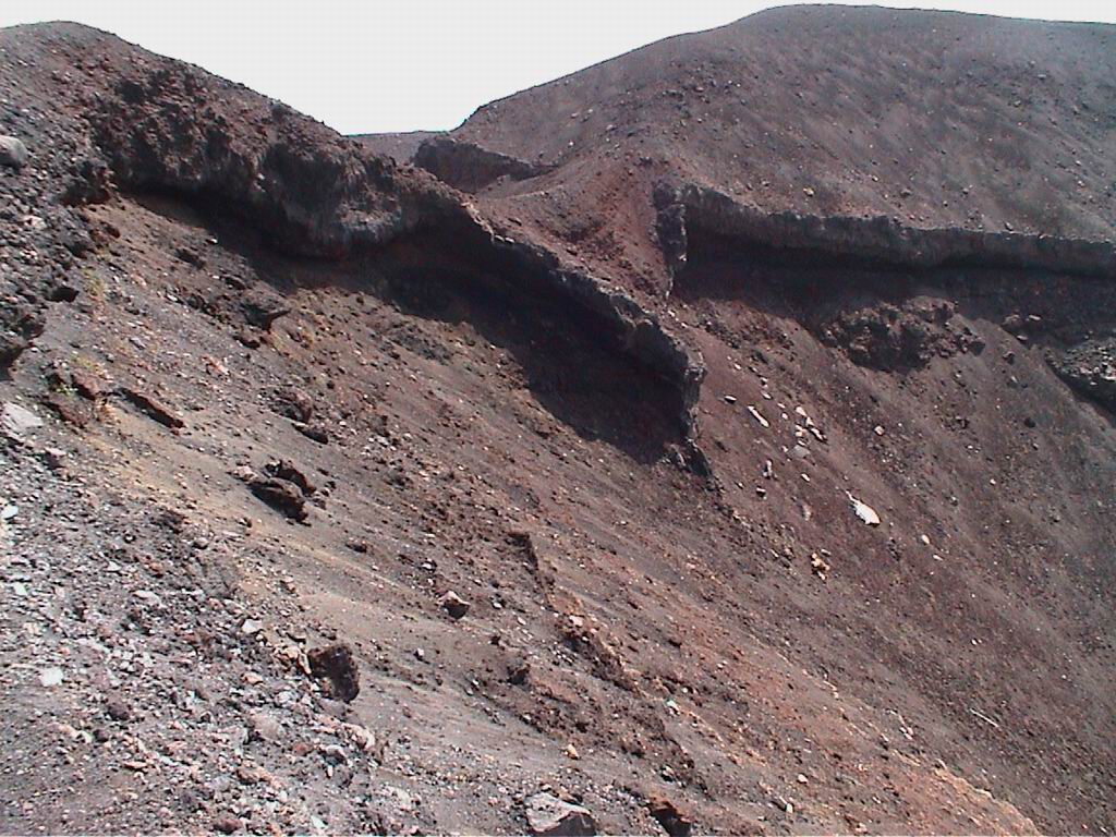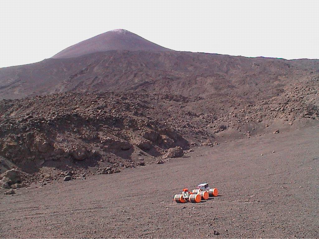 Technical visits to volcanic sites (Etna, Stromboli and Vulcano) were organised in the spring-summer 2000 and detailed discussions were carried out with vulcanologists, in order to investigate the requirements of a system. An important consideration that was immediately apparent was the extremely rough and difficult volcanic terrain. In Fig. 1 two examples of typical terrain are shown. Moreover ground surface change can occur in a short distance changing from rough lava to rocky surfaces or sandy slopes. As a consequence it was clear that the design of a system capable of coping with all of the possible situations exceeded current robotic capabilities.  It was therefore important to concentrate on specific kinds of missions that could be accomplished by the robot on specific types of terrain. It was also decided to place a limit on the negotiable slope of the ground to avoid the necessity of an umbilical cable. In this way the autonomous range can be considerably increased. In particular the distance required for a round-trip mission was assumed to be not more than 2 km. Another important aspect concerned the speed of the system. Many volcanic sites are at a very high altitude, where weather conditions can change rapidly. Moreover during a mission volcanic activity can change suddenly and make the site very hazardous for the robot. An important  consequence was a requirement for a driving speed of at least 1.5 km/h.  Other specifications have been drawn on the basis of direct measurement of the site, also taking into account that the direct locomotion over hot lava is not required for scientific purposes. Moreover in most situations even if the shortest direct path is very rough and difficult, there was always an alternative path to the target which was easier to negotiate. Other important considerations were dictated by practical and logistic reasons.  For example the weight and the dimension of the system was chosen to allow the system to be transported easily to the proximity of a volcanic crater.  Usually the roads to reach these sites are not suitable for any type of ground vehicle and in some cases the helicopter transport is the only option.