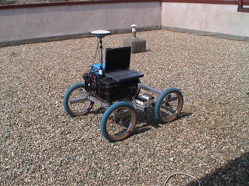 In order to measure volcanic terrain features a four wheel probe was built. This cart, shown in Fig. 2, was manually driven into quiescent craters, to simulate possible paths taken by a robot inside the craters. The probe carried the following instrumentation GPS, encoders in both wheels, a video camera, temperature, humidity and pressure sensors. A more detailed description is reported in the deliverable D2.b and in the articles [14] and [15].