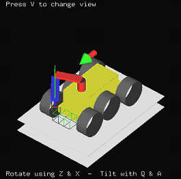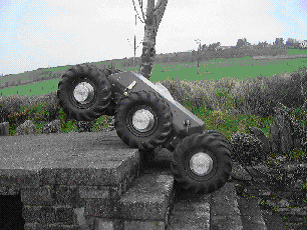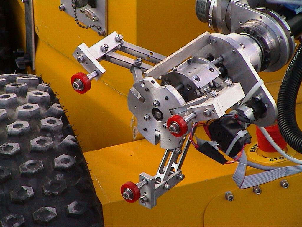 The Marsokhod rover is an all terrain vehicle developed by the Mobile Vehicle Engineering Institute (VNIITransmash) in Russia for planetary exploration [11]. The chassis (100cm wide, 150cm long, 35kg unloaded mass) consists of three pairs of independently driven titanium wheels joined together by a three degree of freedom passively articulated frame. This design enables the rover to conform passively to very rugged terrain. The amplifiers, motors and batteries are mounted inside the wheels to provide a very low centre-of-gravity. The robot can travel at speeds up to 12 cm/sec and can traverse obstacles up to 30 cm high and slopes up to 45°. The duration of operation with batteries is approximately 6 hours.