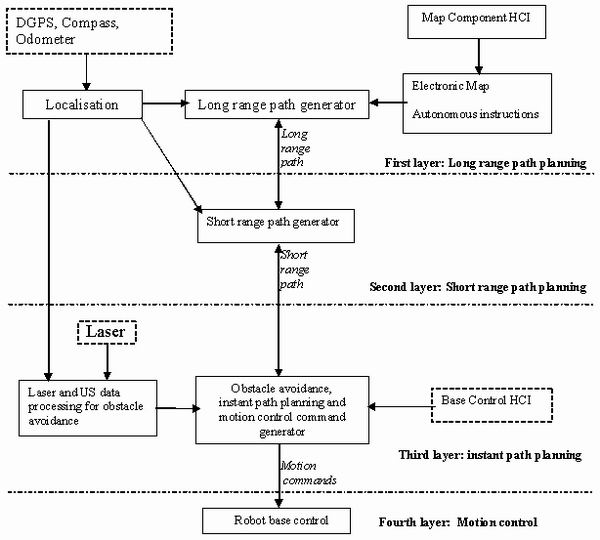The autonomous navigation is implemented in a four-layer structure, shown in Fig. 7 (these layers are; long range planning, short range planning, instantaneous path and the motion control layer). These are described below.